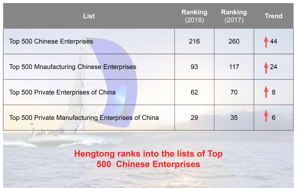Hengtong ranked 216th in “Top 500 Chinese Enterprises” and 93rd in “Top 500 Manufacturing Chinese Enterprises” released by China Enterprise Federation in Xi’an; ranked 62nd in “Top 500 Private Enterprises of China”, and 29th in “Top 500 Private Manufacturing Enterprises of China” by China Federation of Industry and Commerce.